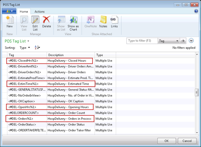 Here you see that four tags are used, to show the opening hours, closed hours, estimated time for orders and number of orders in the restaurant. The tags actually have %1 in them. You need to set up the first button only with the correct tags, then you can copy the first button to the other buttons and replace only the restaurant and the main description. The program replaces %1 with the appropriate number when you open the #DEL-ORDER panel up.