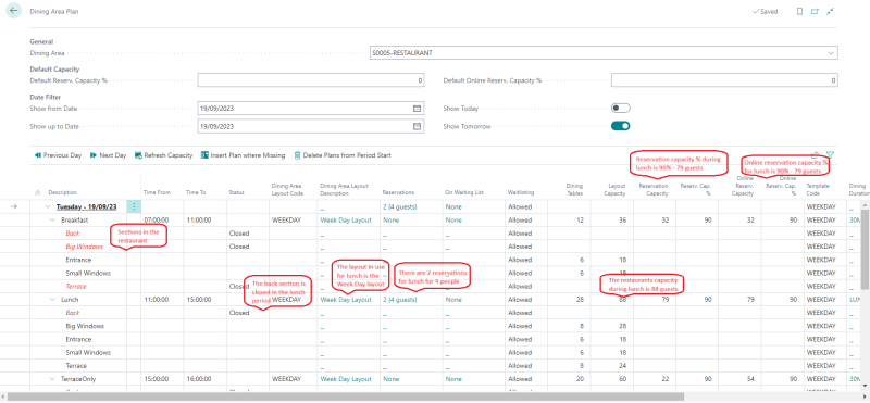 The program uses the existing dining area plan templates to create a dining area plan for each day in the period. It picks the first template with the highest priority that is valid for the day. If there is no template valid for the day, the dining area is closed that day.