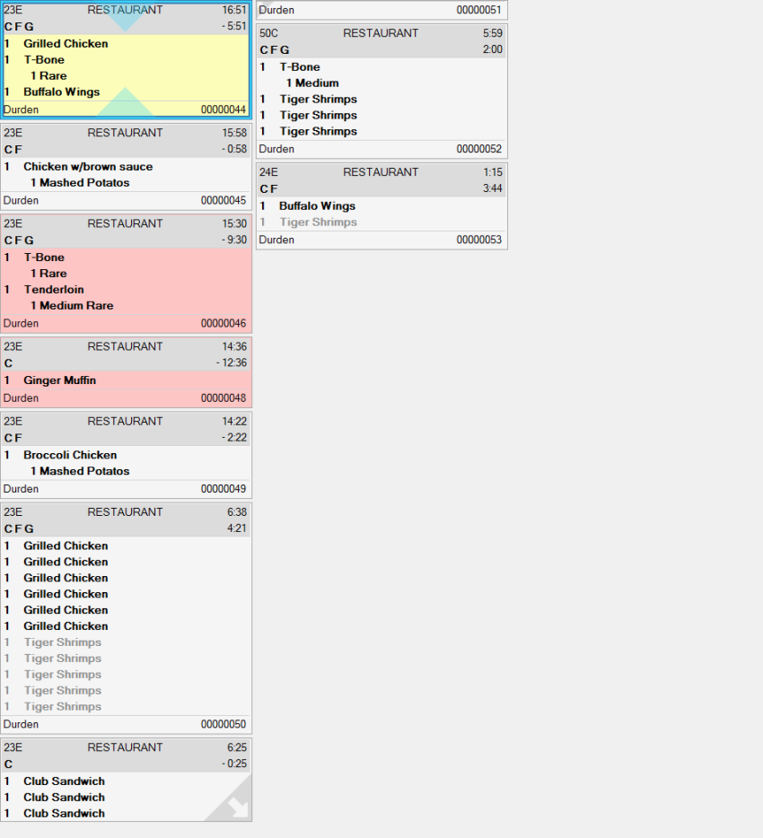 - On the left, the table number and an ID for the preparation stations the items are sent to.