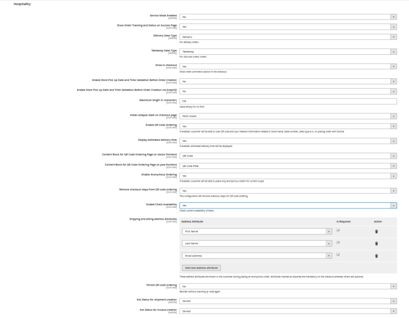 | Shipping and billing address attributes: | Option to add address attributes shown to the customer during the placing of an anonymous order. Attributes marked as required are mandatory on the checkout whereas others are optional. |