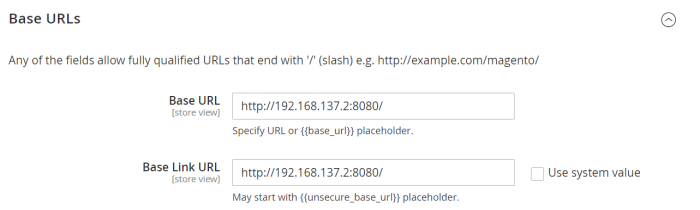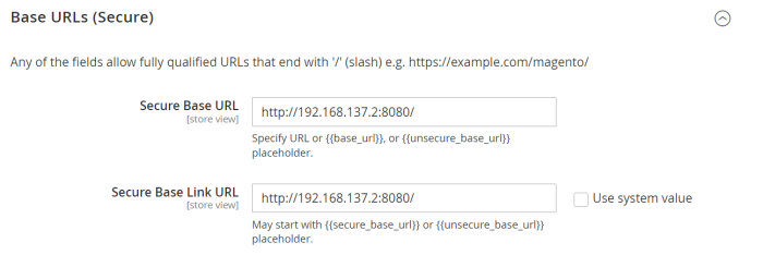 - Update the base link in Magento admin for both the Base Link URL and the Secure Base Link URL.
