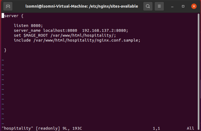 Run the vim /etc/nginx/sites-available/hospitality command from the terminal to edit the virtual host file of the nginx configuration: