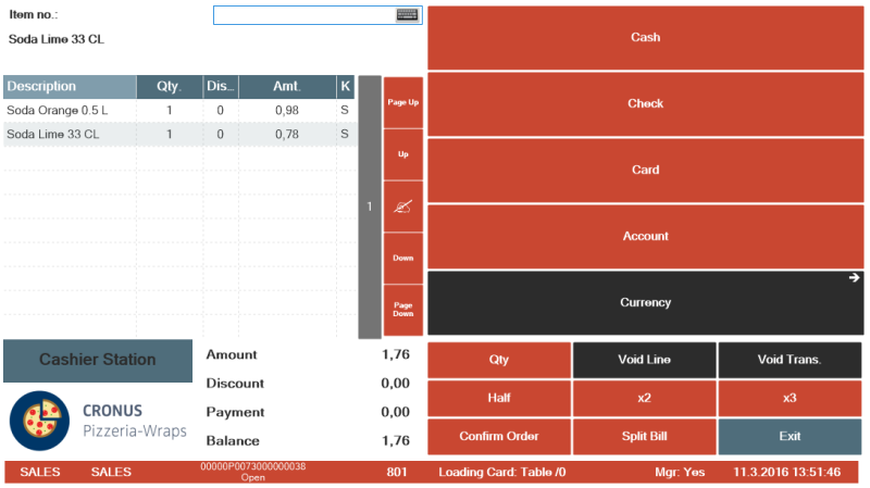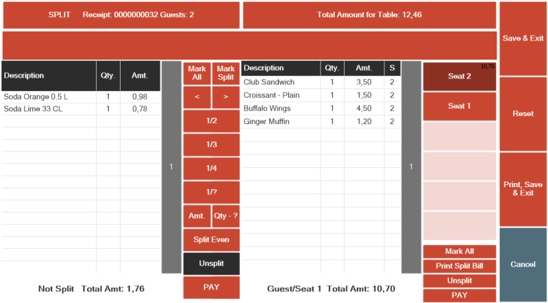 Either Pay button can be pressed now to pay for the food or the drinks. Pressing Pay on the drink side opens a new transactions with the drinks.