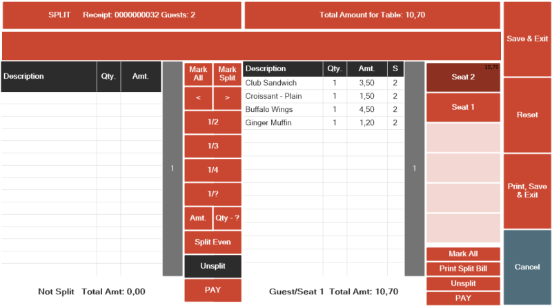 At this point either customer can pay for both cards or they might want to split the bill some other way. In this case one wants to pay for the drinks and the other for the food. Pressing the Split Bill button opens the Split Bill window.