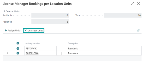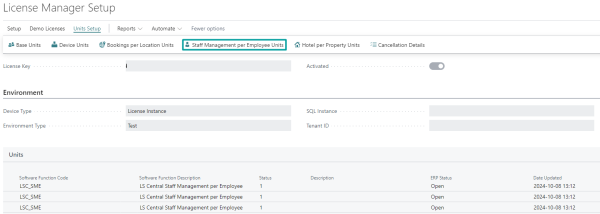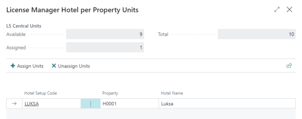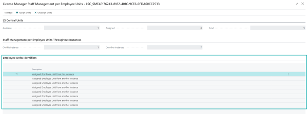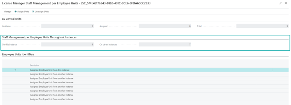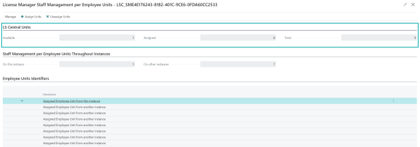 In the first section, named LS Central Units, you can see how many Staff Management per Employee Units you have, how many are assigned, and how many are available to be assigned.