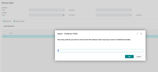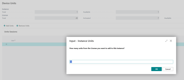 To have more LS Device Units available in the current Instance, click the Add Units action. You are asked to choose how many should be added, and as before this number depends on how many LS Device Units are available on the License.