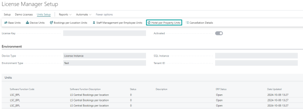 - In the License Manager Setup page, click the Units Setup menu, and then the Hotel per Property Units action.