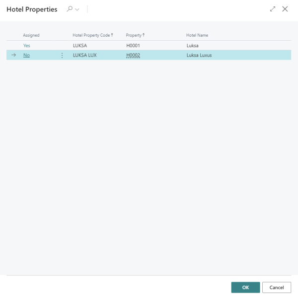 A page is displayed with a list of all your Hotel Properties. Here you can identify the ones already assigned. Select one or more to be assigned, and click OK.