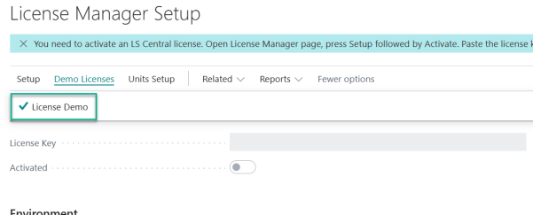 - Insert the license key provided by LS Retail in the License Key field, and select the relevant Environment Type that you are setting up.