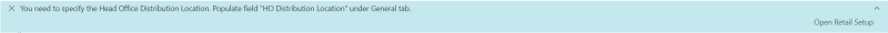 This notification is displayed until the field HO Distribution Location is populated in the Retail Setup page: