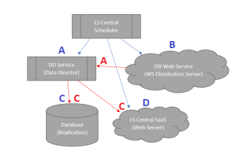 LS Central 16 and later no longer includes the DD Add-ins DLLs and TransAutomClient control that used to handle all communication from LS Central to the DD. Scheduler sends the job data to DD Web Service which runs under IIS, generates standard DD Data package, and then sends it to the DD Source Service.