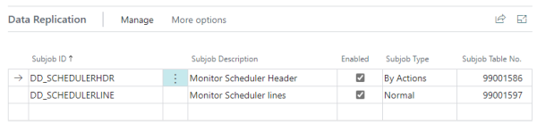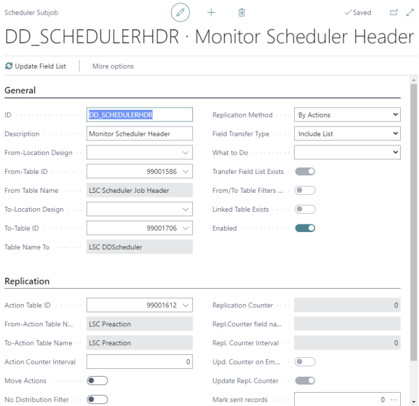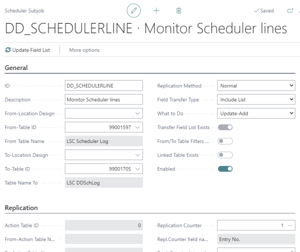 Create Normal Job for Scheduler Log lines that maps Scheduler Log to DDSchLog table. Select Include List in the Field Transfer Type field, and choose field 1 Entry No as Replication Counter.