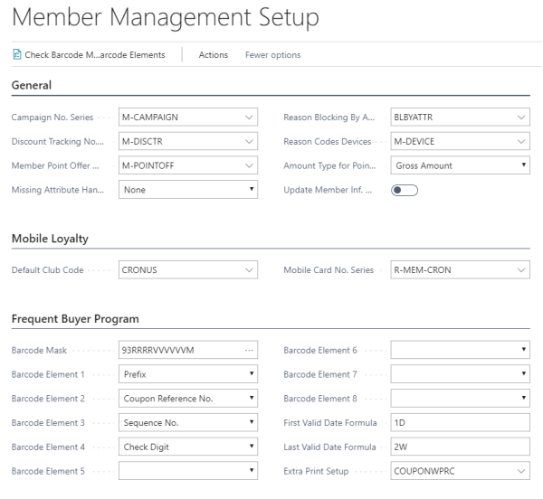 Note: In the above example, the Barcode Mask four-digit Coupon Reference No. will be created with the FBP No. This means that you can create up to 9999 programs. For each program you can create 999999 coupons. If your business is more like many programs but fewer coupons, then you can change the number of digits for the reference and sequence numbers but the total must be 10 digits. If you change the length of the Reference number, you must change the number series for Frequent Buyer Programs in Store setup for HO accordingly.