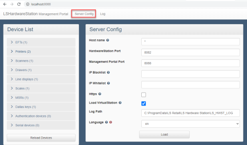 If you select the Server Config option at the top of the Management Portal, you can configure various properties of the LS Hardware Service.
