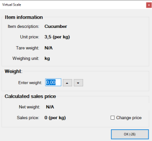 The Virtual scale can be used to emulate communications with a scale. The Virtual Scale can calculate the price and tare, and it depends on configurations in the LS Central system if the results of those calculations are returned.