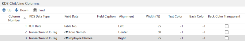By selecting KDS Data Type as Transaction POS Tag in the KDS Chit/Line Columns section, all tags of the type Transaction can be selected and added to the Chit Header, Footer or Column in the Line Display.