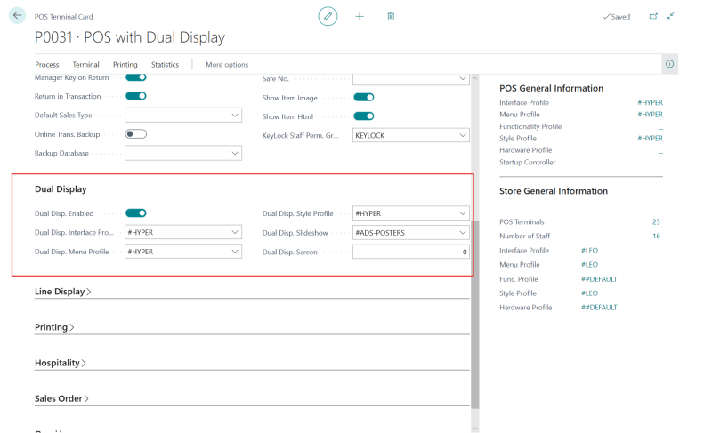 - Open the POS Terminal Card in use, and assign the new Interface Profile in the Dual Disp. Interface Profile field.