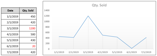 A 7-day sales history data for an item with a very high number of sales on the 3rd of January (Qty. Sold = 1200), and a very low number of sales on the 6th of January (Qty Sold = 20):