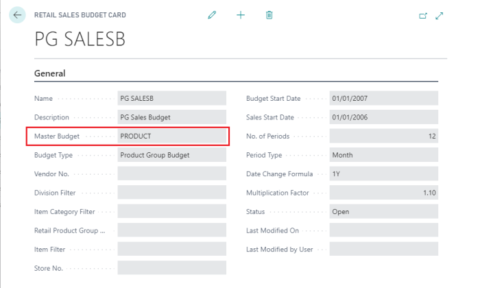 - In the Retail Sales Budget List or Retail Purchase Budget List page, select a master budget, and click the Sales Budget or Purchase Budget action to open the Retail Sales Budget or Retail Purchase Budget page.