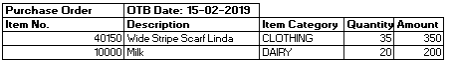 The item category STATIONERY has no sales budget values defined and the Check Purch. Order (Ignore Zero Budget Lines) setting for Sales budget ITEMCAT is TRUE. Therefore, the Open-to-Buy checks for this item category will be skipped.