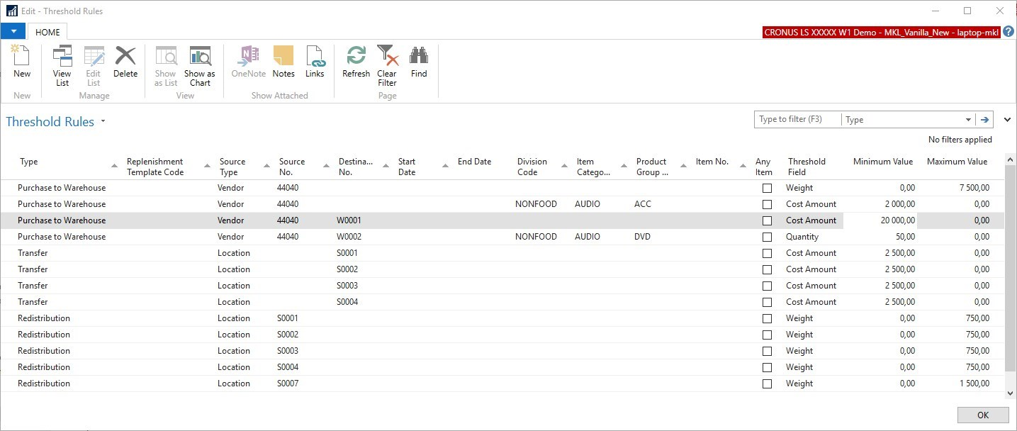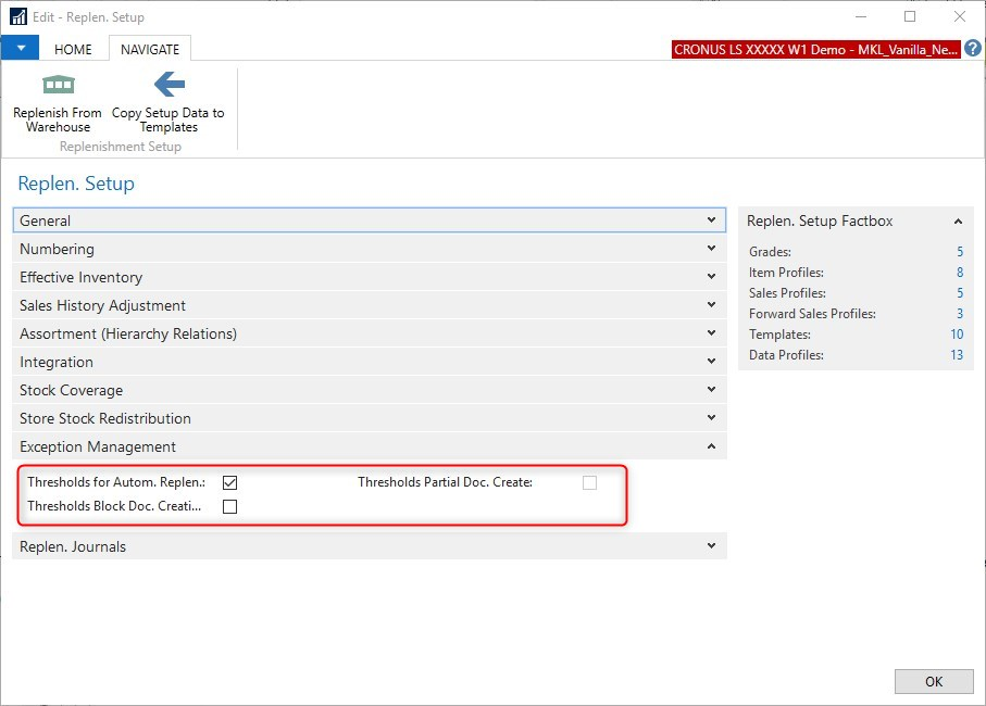 The Thresholds calculation can be activated in the Replen. Setup page, FastTab Exception Management.