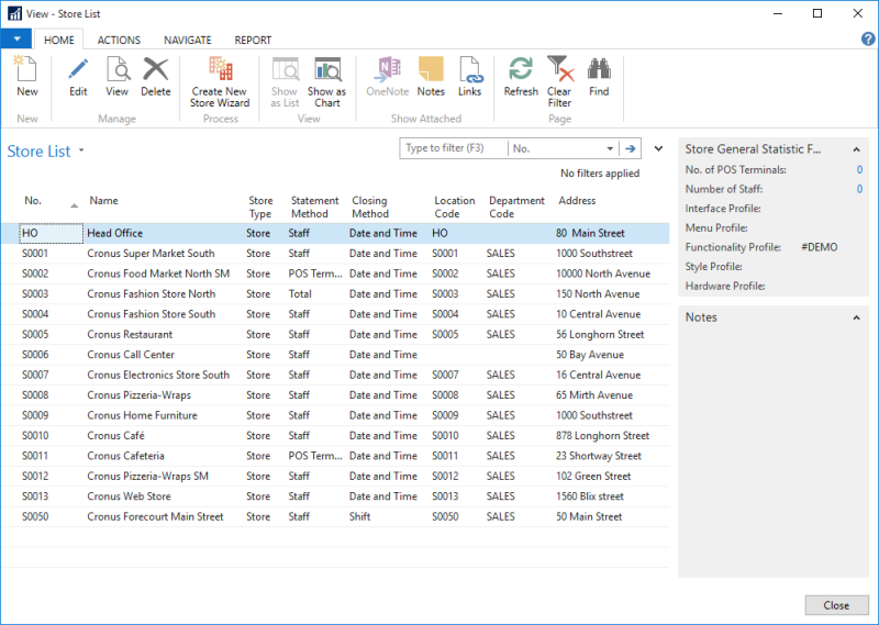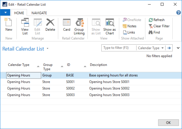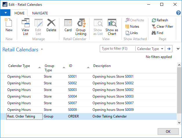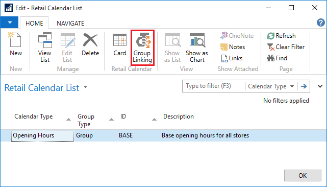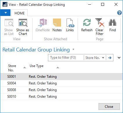 Group linking can be accessed through the Retail Calendar FastTab on both the Store and Restaurant Cards. It allows group calendars to be linked to stores.