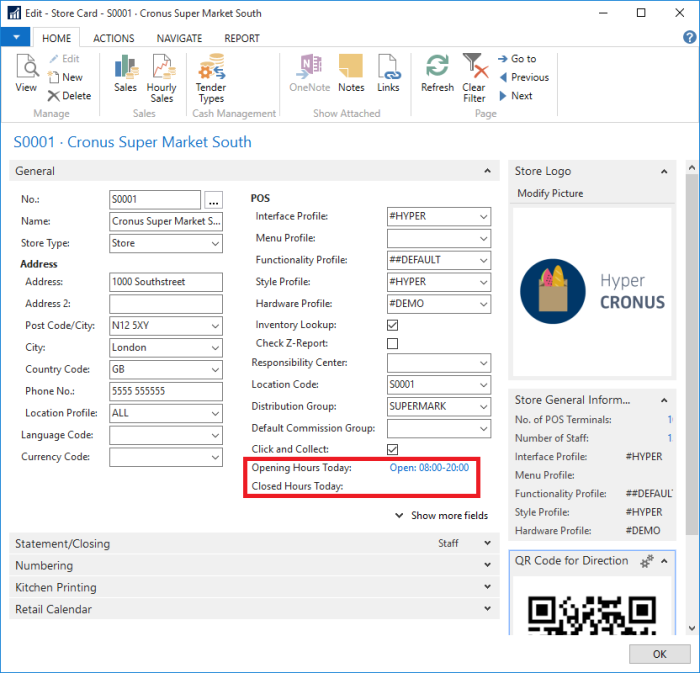 On the General FastTab of the Store Card and the Restaurant Card there are fields that display the opening hours and the closed hours of the store today.