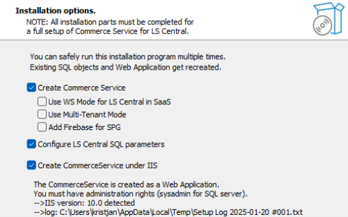 The setup creates the CommerceService service in IIS and the Commerce database. You can run the setup multiple times to update and to recreate and override objects in the existing Commerce database.
