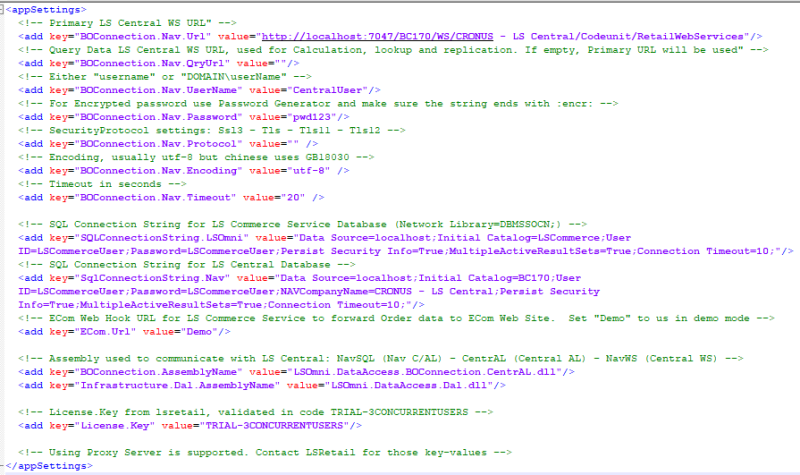 | BOConnection.Nav.Url | Main URL to theLS Central RetailWebService web service. http://Centralhost:PORTNO (ie.7047)/BCINSTANCE(ie.BC210)/WS/COMPANYNAME(ie.CRONUS - LS Central)/Codeunit/RetailWebServices |