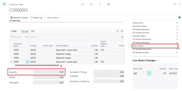 - Open the Customer Order page in LS Central. Go to this exact order and see the difference between the initial and the updated order. There is an increase of 1 in the Quantity field, and the Sales Orders line in the FactBox has also been updated to 2.
