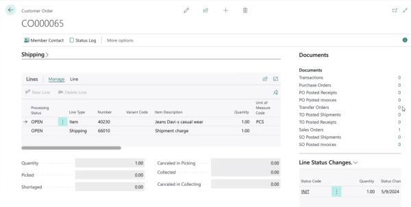 - Create and open your order in LS Central. To see your initial order, navigate to the Lines section.