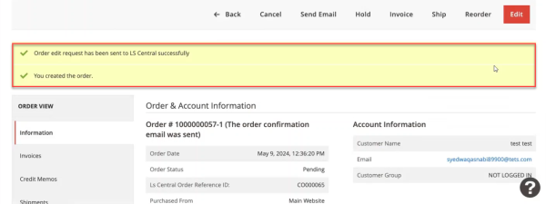 - A notification pops up saying the order edit request has been sent to LS Central.