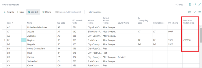 To set up VAT calculation, you must configure the countries to be replicated with a Web Store Customer No. in the Countries/Regions page in LS Central: