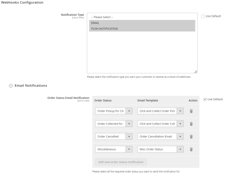 | Notification Type: | Option to select the notification type when an Order status is updated. There are two options, email notification or push notification. |