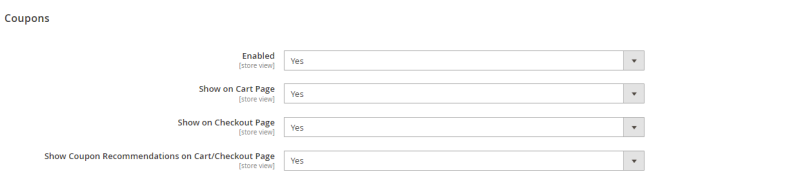 | Show on Checkout Page: | Option to enable or disable coupons in the Checkout page. |
