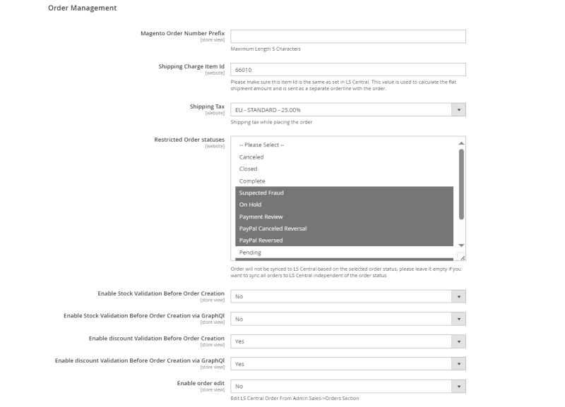 | Restricted Order statuses: | Orders with selected order statuses will not be synced to LS Central. |