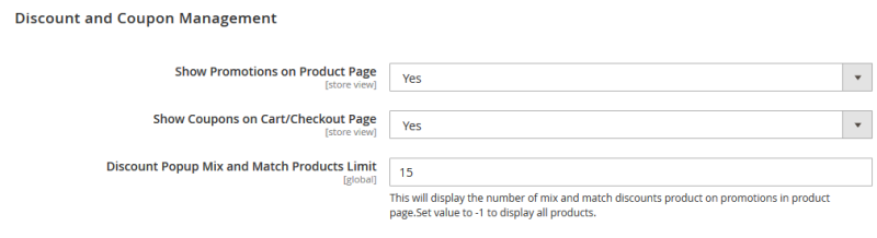 | Show Promotions on Product Page: | Option to show offers/coupons related to a specific product on the Product Detail page. The default value is Yes. |