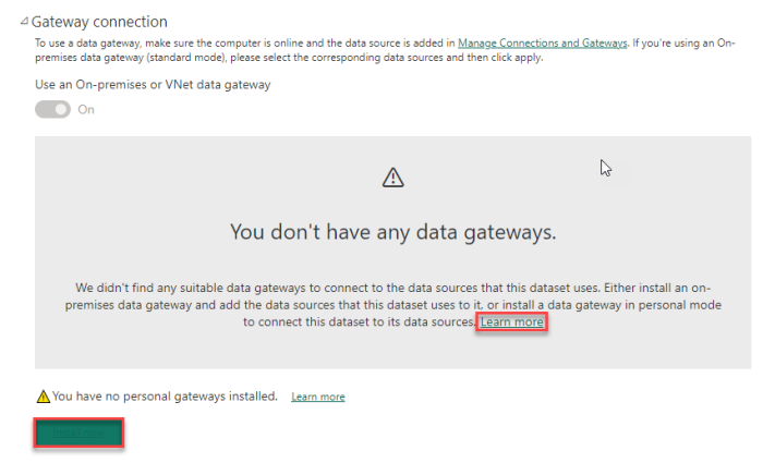 - If Gateway has not been set up, the expanded Gateway connection section will look like this and you will need to set up a new gateway. You can do this either by going to the Manage Connections and Gateways or select the Install now button to install a personal gateway.