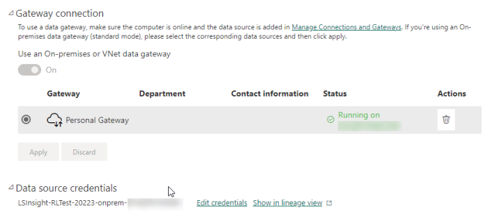 - When you are done setting up the gateway, you might need to refresh the credentials, but once you have entered the credentials to connect to the database, the Gateway Connection and Credential sections will look like this and you can proceed with setting up the scheduled refresh: