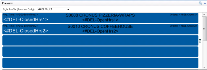 Here you see that four tags are used, to show the opening hours, closed hours, estimated time for orders and number of orders in the restaurant. The tags actually have %1 in them. You need to set up the first button only with the correct tags, then you can copy the first button to the other buttons and replace only the restaurant and the main description. The program replaces %1 with the appropriate number when you open the #DEL-ORDER panel up.