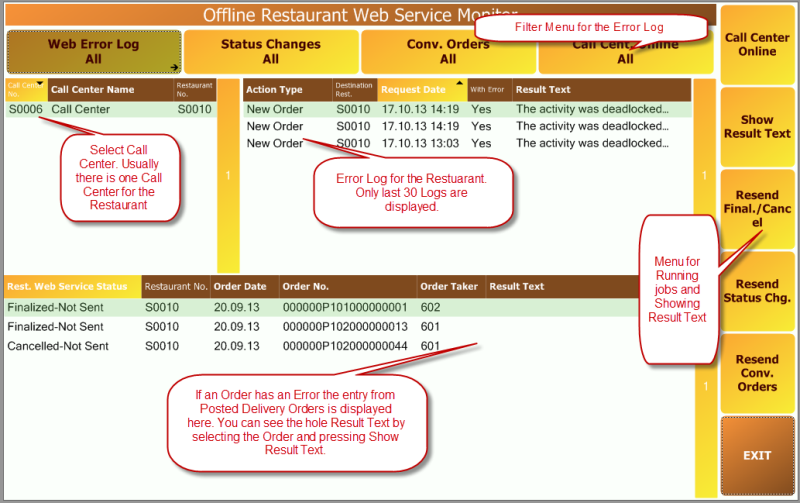 You need to set up a Web Service Monitor in the Call Centers and Restaurants. You use the monitor to have an overview over the communication between the databases. The monitor window shows the latest result of the various processes going on and from here you can run the processes directly.