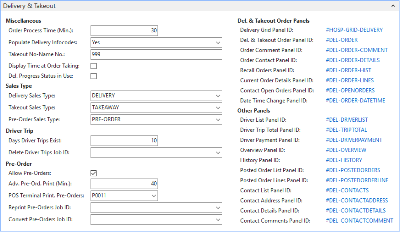 The following table lists each panel used in Delivery & Takeout, its description and the codeunit that handles it. It indicates what command is used to open it up and from where.