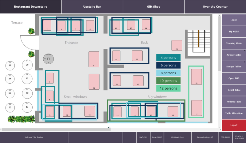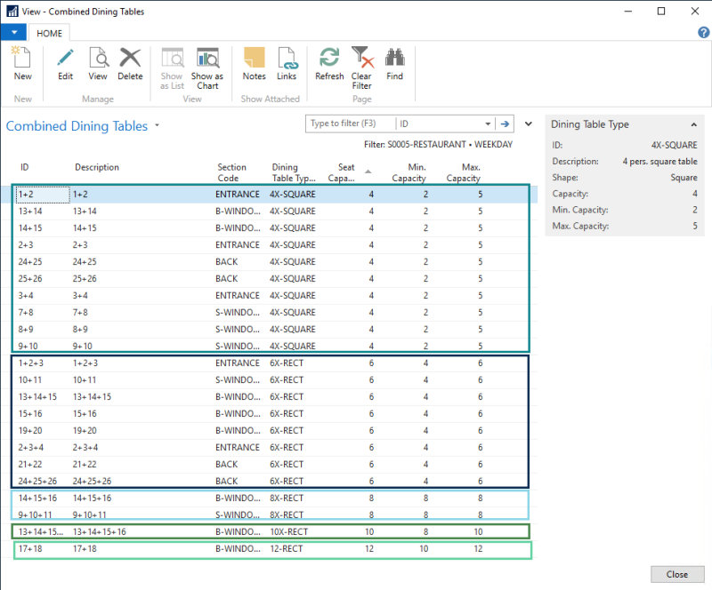 You can set up the possible combinations of dining tables within a dining area layout to help the staff with manual allocation of dining tables. They can quickly see what combination of dining tables they can use, when no single tables are available for the requested number of guests.