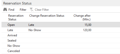 - On the Reservation Status FastTab, you can let the system automatically change the Open status to Late and Late to No-Show after a certain time period.