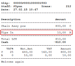 The Tips in button is a simple way of registering a tip amount that is posted to an income account. If you are using hospitality types in your restaurants, you can control how the receipt prints suggested tips or lines for the customer to write on and register the tip amount easily in a tips panel, using the TIPS_SUGGESTIONS command.
