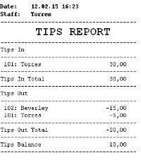 The POS prints out details showing Tips received, Tips paid out and Tips Balance since the last Z-Report printing: