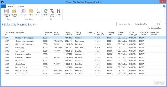 Field Description Restaurant No. You need to select the restaurant you are testing for. If the current user is connected with a local store, the store is automatically selected in the field when the page opens. Sales Type You can select which sales type is active for your test. If there are no mapping lines that specify sales type, you don't need to select a sales type. POS Terminal No. You can select for which POS terminal you are testing for. If there are no mapping lines that specify a POS Terminal or a POS Terminal group, you don't need to select a POS terminal. Test Load Configuration The Active for Restaurant and Active for Hospitality Type fields show what load configuration code is active for the restaurant and for the hospitality type (that is, if you have specified a sales type and there is a hospitality type registered for the restaurant with this sales type). The Test Load Configuration field shows the active load configuration after you select a restaurant and/or a sales type (if the hospitality type has a non-blank load configuration, this load configuration is the active one). You can select a different load configuration to test the routing and mapping with it.