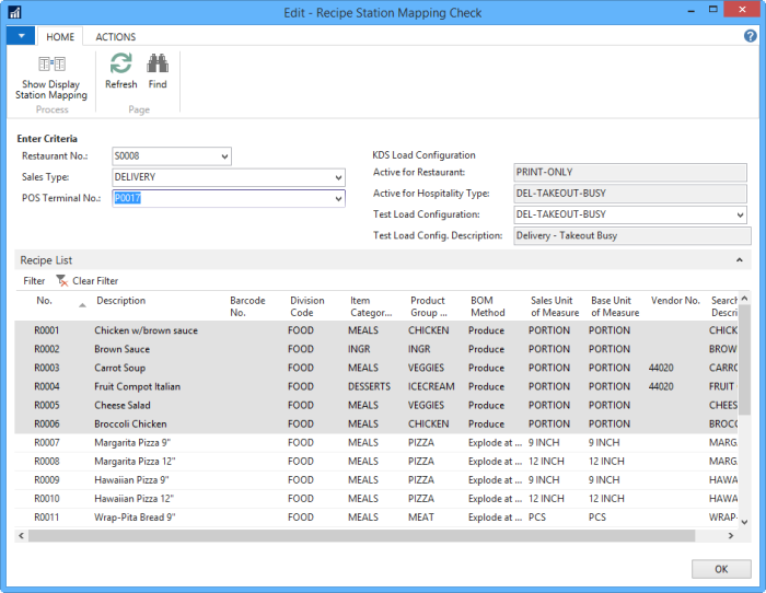 To check the result of the production section routing and display station mapping you have set up, you can use the Recipe Station Mapping Check and Retail Item Station Mapping Check pages.