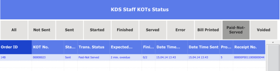 This example displays the KOT's status when the order is paid before it works with the KDS system.