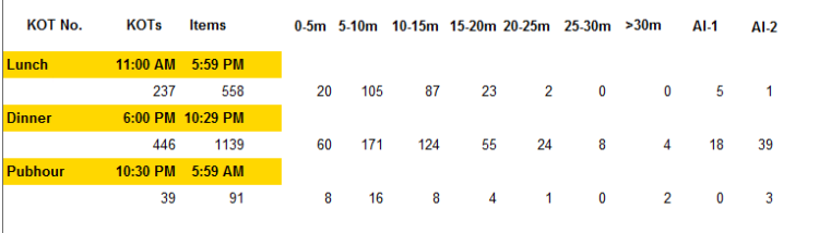 - >30m: The total of KOTs that took more than 30 minutes to prepare.
